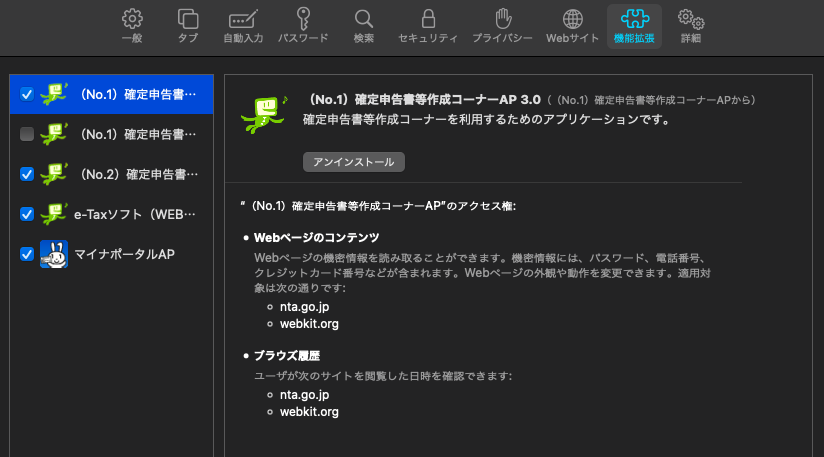 いろいろWebで解決策を探しましたが、見つかりませんでした。ここまで来たのに一からやり直して今年は郵送か?と思っていたのですが。おかしなところを見つけました、拡張機能。