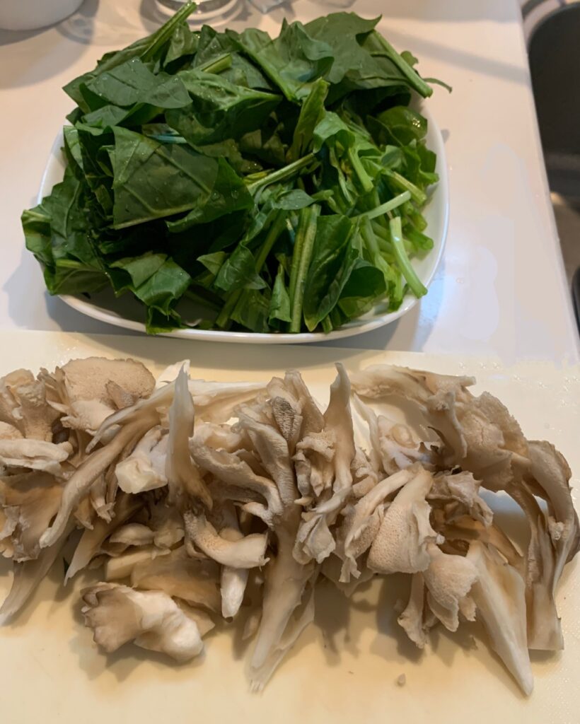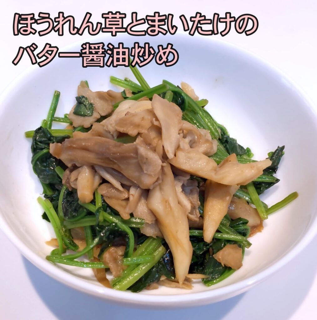 まいたけに火が通ったらほうれん草を加え、さらにしんなりするまで炒める。
